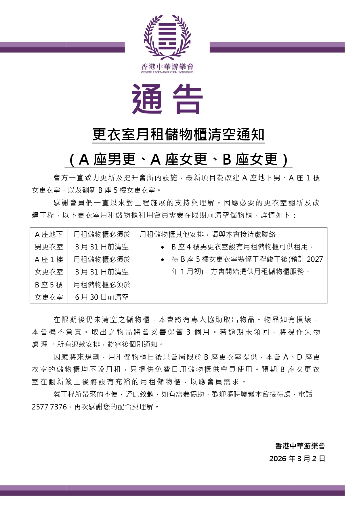 更衣室月租儲物櫃清空通知